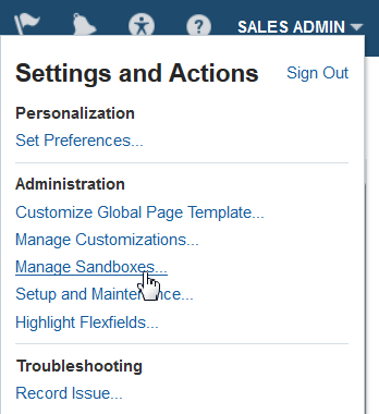 - In Oracle Sales Cloud, open the drop-down menu next to your user name, and select Manage Sandboxes.