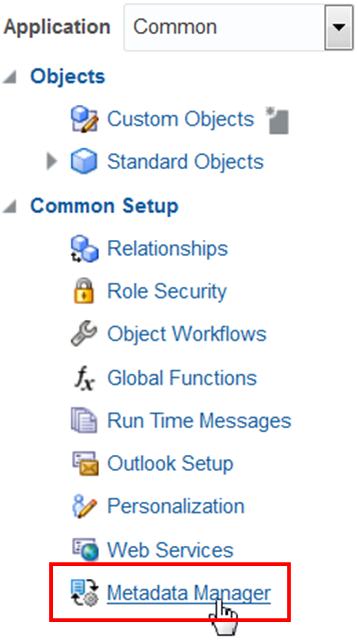 - From the navigation tree on the left, under Common Setup, click the Metadata Manager link.