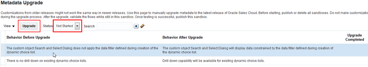 This document describes the steps you must take to manually upgrade the metadata from an older release to the latest release of Oracle Sales Cloud. By following these steps, you ensure that those customizations have incorporated the latest enhanced behavior.