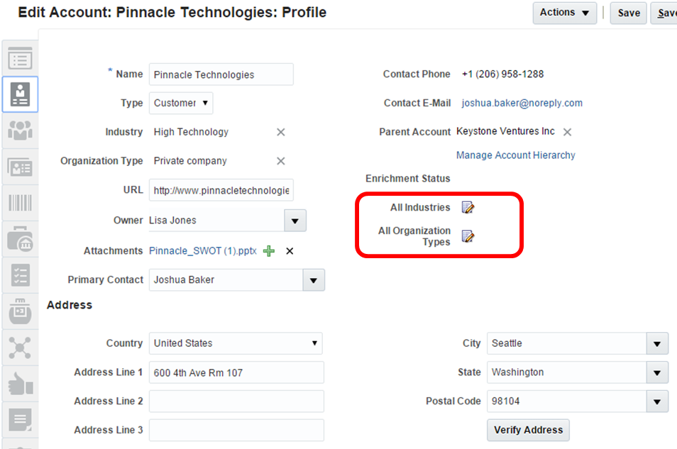 New feature: Organization information can be synchronized between Oracle Sales Cloud and Siebel CRM. |