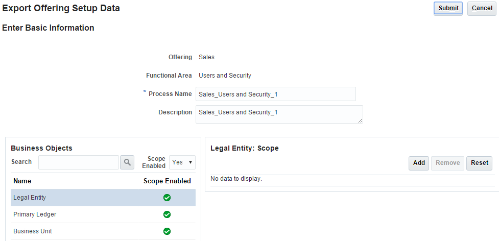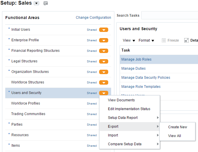 - To export and import setup data for an entire offering that includes all enabled functional areas and features, initiate export at the offering level.