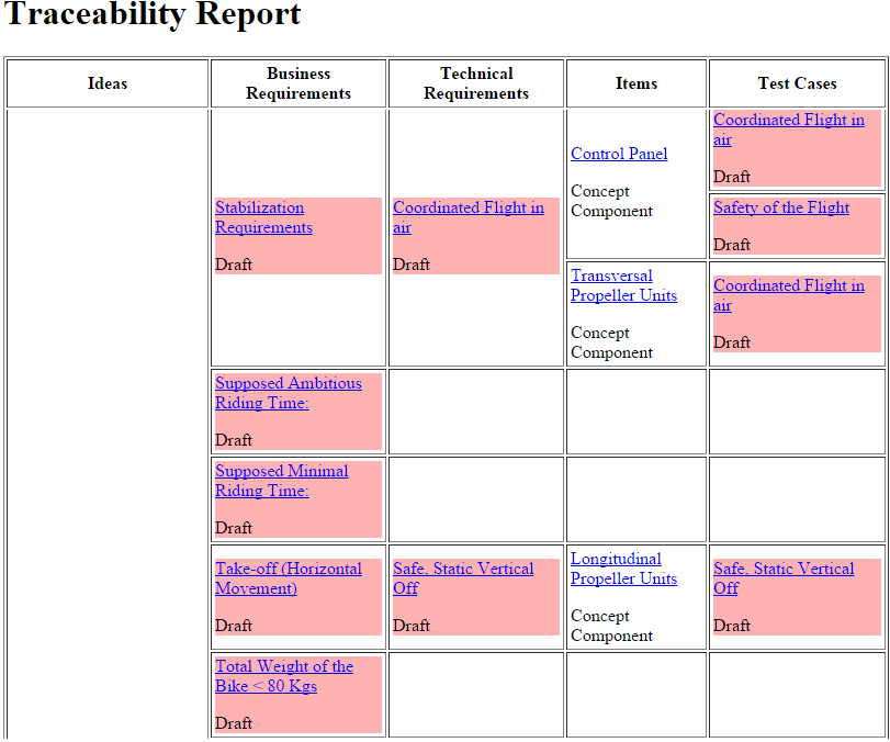 In Release 11, you can export the traceability report in CSV and HTML formats as well as XML format. In the HTML format, unfulfilled requirements and test cases are highlighted. In addition, custom attributes defined for requirements are also displayed in the report.