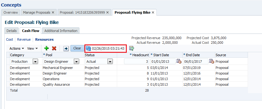 You can now bring the actual resource pool utilization from one or more associated Agile PLM projects to the Resources tab of a proposal using the Refresh icon. A time stamp is also captured, marking the latest refresh.