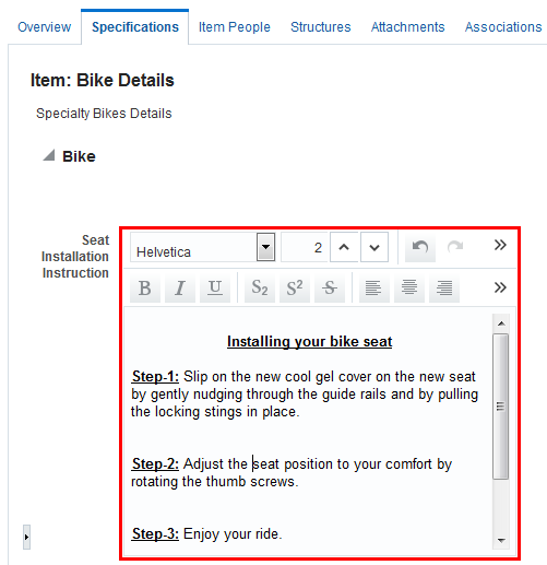 You can now use rich text formatting, such as bold, italic, or indenting, for user-defined attributes (Item Extensible Flexfields). When you share the EFF data across multiple systems, along with the EFF attribute values, its rich text formatting is also shared. This makes it easier to publish well formatted documents such as marketing catalogs and user guides with consistency, using tools like BI Publisher.