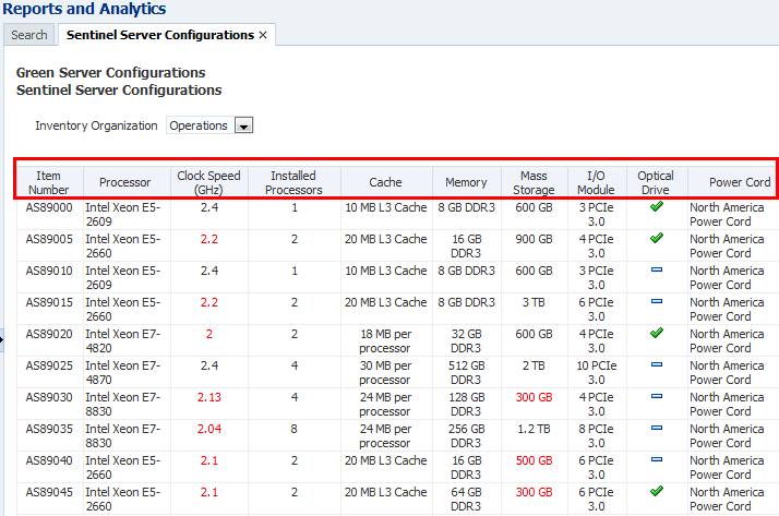 BI Report including pre-defined attributes (Item Number) and EFF attribute (Processor, Clock Speed)