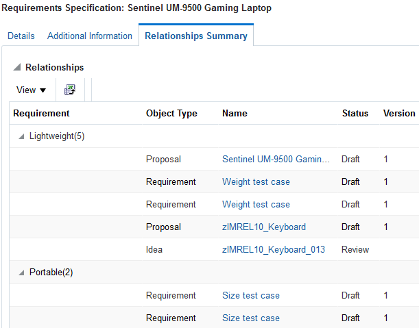 | Simplified View of Requirement Dependencies in Relationship Summary |