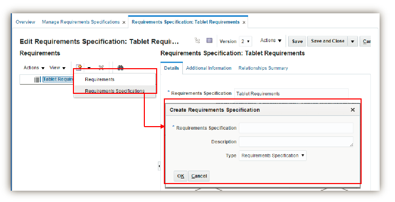 You can now author a requirement specification within a specification. You have the option to either create a requirement or a requirement specification when you are in the context of a requirement specification.
