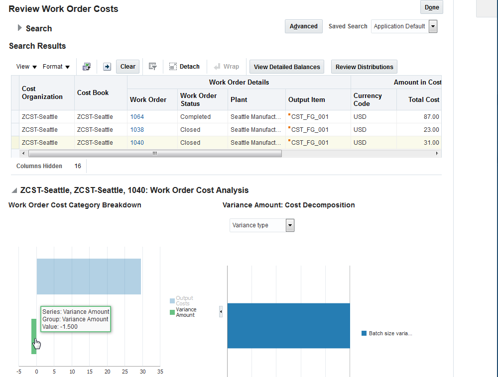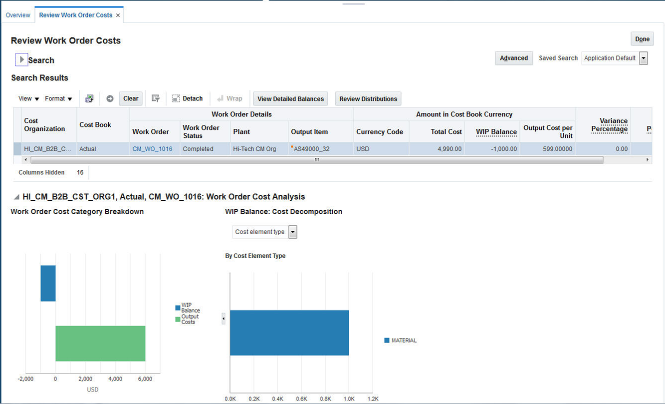 In order to estimate, record, and monitor production costs, Oracle Manufacturing Cloud provides comprehensive cost management capabilities for cost planning and work order costing. For additional details, please refer to the Cost Management section of this document.