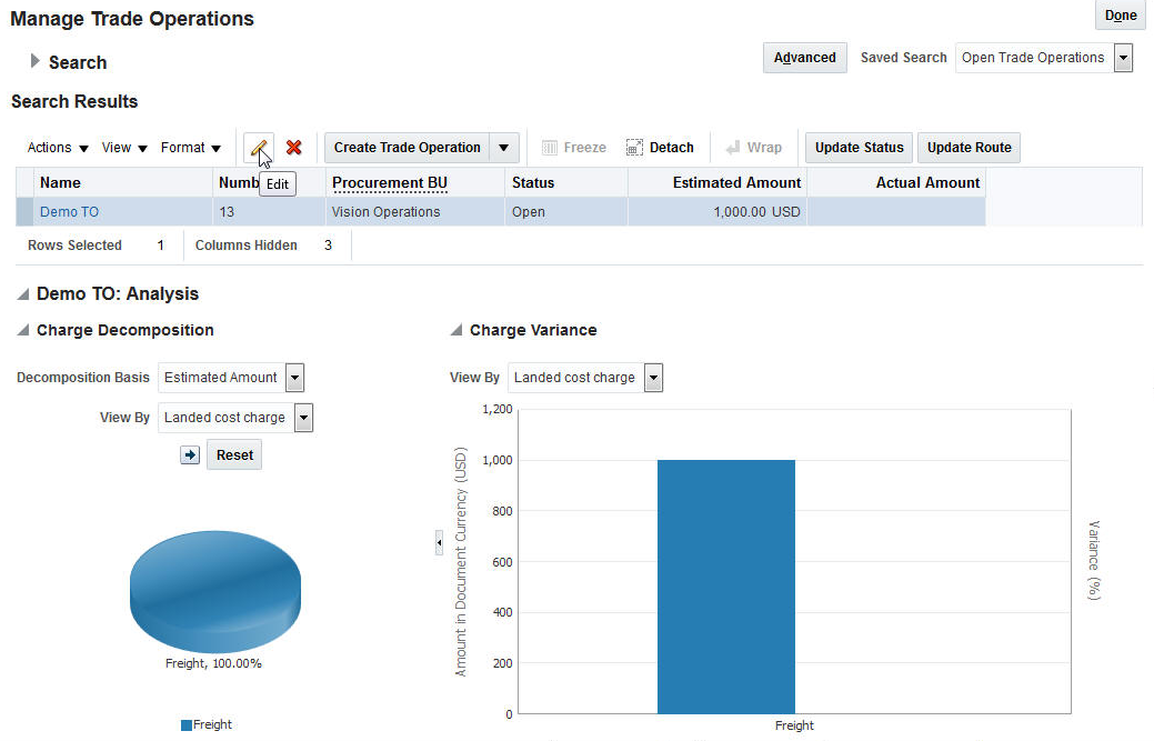 You can monitor line status, fulfillment status, and interface status, and can examine quantity details, including requested, shipped, and received quantities. You can also edit a transfer order; for example, you can edit the source organization, requested delivery date, requested quantity, and so on.
