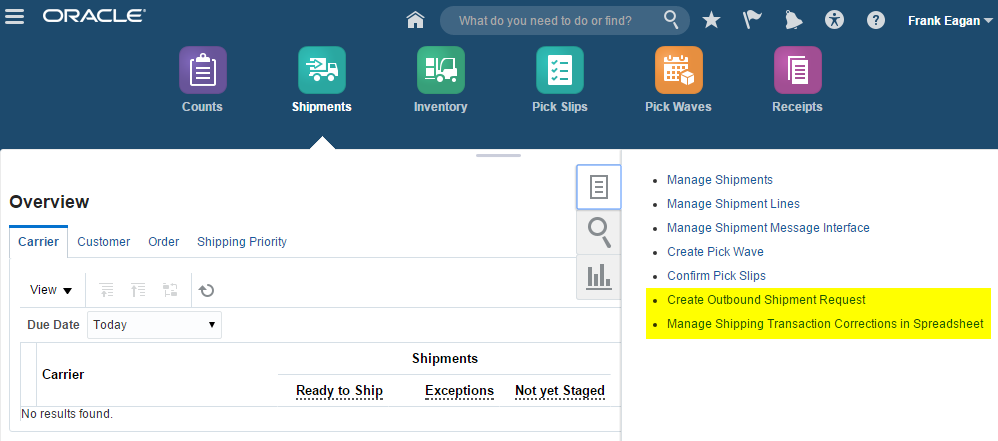 Order Management comes predefined with an integration that interfaces with Inventory Management to receive a transfer order, and then orchestrate it, including schedule, reserve, and ship the order. This integration can orchestrate and manage an internal material transfer across fulfillment systems. You can use the source document type in the Order Management work area to locate a transfer order.