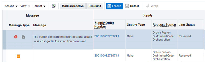 Receive constant visibility into the Oracle SCM Cloud processes that create supply. Use summary views to monitor progress, view errors, and manage exceptions that might jeopardize supply from meeting demand. Use the Supply Chain Orchestration work area to view errors, take corrective action, resubmit to continue processing, or drill into supply details to monitor each task and task progress. Open documents directly from the Supply Chain Orchestration work area to view important information