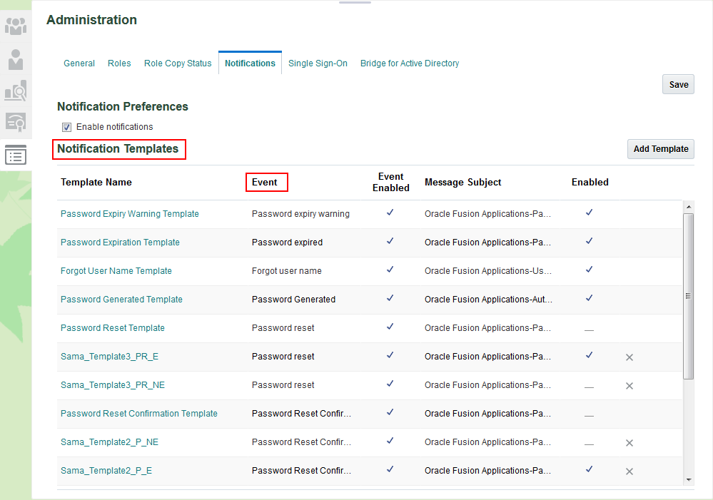 Notification Templates Region in the Administration Page