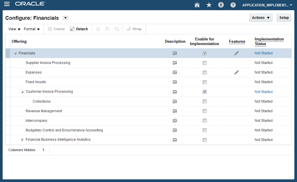 - Only the functional areas enabled for implementation will be displayed on the Setup page. Ensure you have enabled appropriate Offerings and their applicable Functional Areas and Features using Configure page.