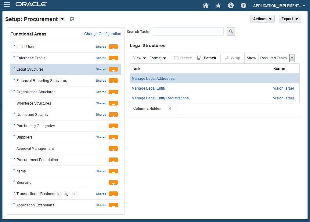 - The list of required tasks for a given functional area is displayed by default. Change the selection to All Tasks to view and perform all other relevant tasks of the functional area.