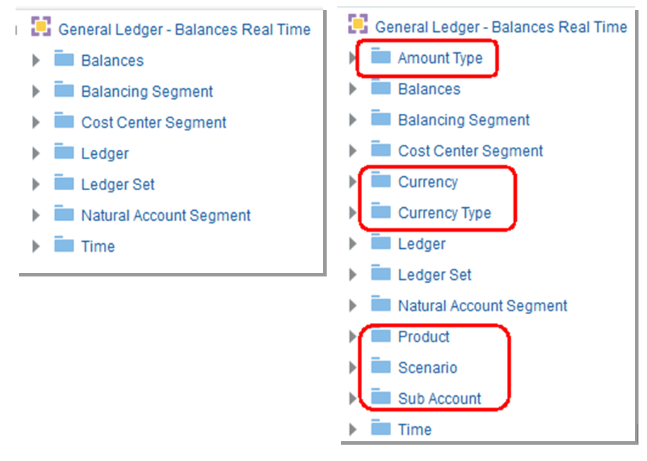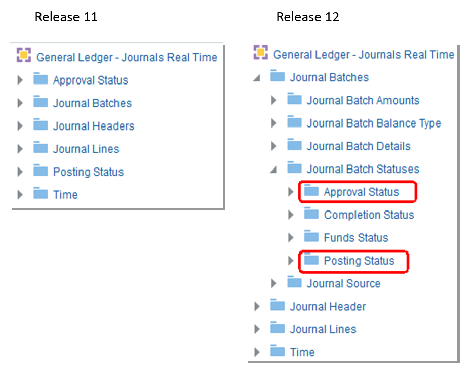 Descriptive flexfields have been added to the following General Ledger subject areas to expand the available transaction data for reporting.