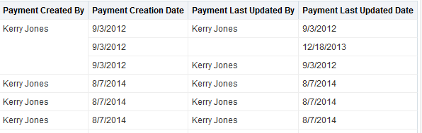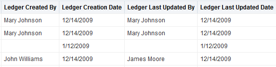 Creation Date, Created By, Last Updated Date, and Last Updated By columns are now available in the following subject areas: