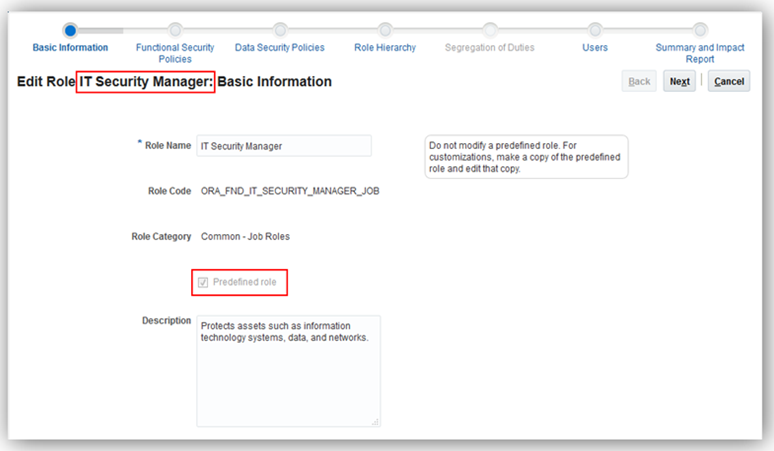 Locking down these security artifacts enables safe upgrades to pre-defined roles, since the possibility of conflict with customer introduced changes to these roles is now eliminated. This, in turn enables customers to safely adopt new enhancements that may be delivered with pre-defined roles in future releases. As in R11, customers can make copies of pre-defined roles and freely customize these copies.