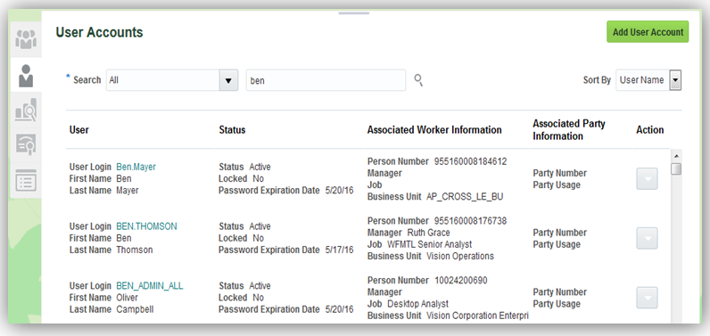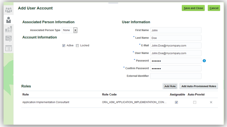 You can now create and manage implementation user accounts within Oracle Fusion Applications Security. You can assign roles to these user accounts using the following navigation: Tools > Security Console > User tab. You can also search, retrieve, and manage user accounts automatically created for employees, contingent workers, supplier contacts, or partner contacts