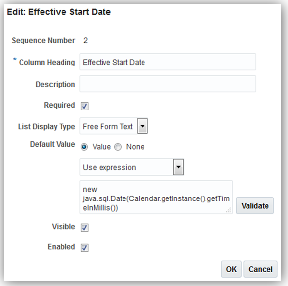 To specify a groovy expression to derive a default value, you select the attribute in the Selected Attributes section of the Design page and click Edit. In the Edit dialog box, set Default Value to Value and select Use expression from the choice list. Enter the expression in the text area and click Validate to ensure your expression is valid.