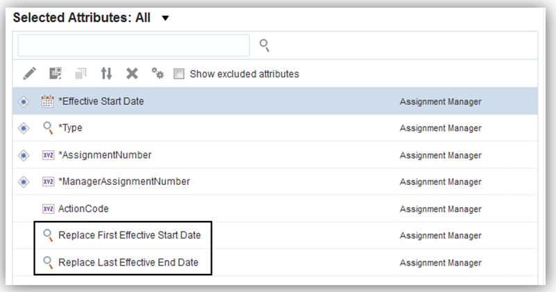 Two new attributes, Replace First Effective Start Date and Replace Last Effective End Date, have been added to the list of available attributes on the Design page of Manage Spreadsheet Templates. If you include these attributes in your spreadsheet template, then the spreadsheet user can indicate that the first start date or last end date is to be changed. For example, to end an element entry the spreadsheet user would specify the end date in the Effective End Date column and enter Y in the Replace Last Effective End Date column.