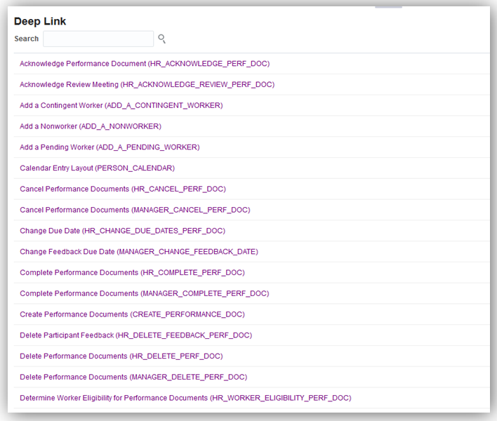 To view a complete list of the available Deep Links, use the HCM Deep Link task in the navigator. The list of deep links that appear in the page is based on your functional and data security.