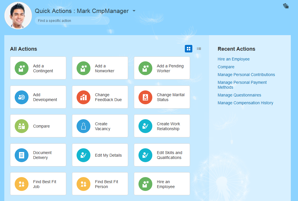 You can quickly access different tasks from the Quick Actions page, which is available for the predefined employee and contingent worker roles. You can view and access actions available to you according to all your roles (for example, employee, line manager, and human resource specialist). This means that if you are an employee and an HR specialist the quick actions will include actions for both roles. This feature eliminates the need for you to be familiar with the work area organization and searching for tasks.