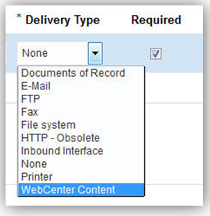 The following screen capture illustrates the Delivery Type field with the WebCenter Content option highlighted.