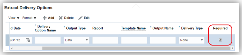 Use the Required option to specify which delivery options you need to run successfully in order for the extract run to succeed. For example, use the Required option for critical delivery options such as payroll bursting. If this delivery option fails, then the extract run will also fail because it is dependent on the delivery option completing successfully.