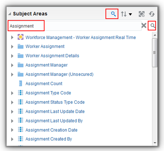 You can search in the subject area pane in OBIEE Answers. To use Search, click the Search icon on top of the pane, enter the text you are seeking, and click the search icon next to the text you entered.