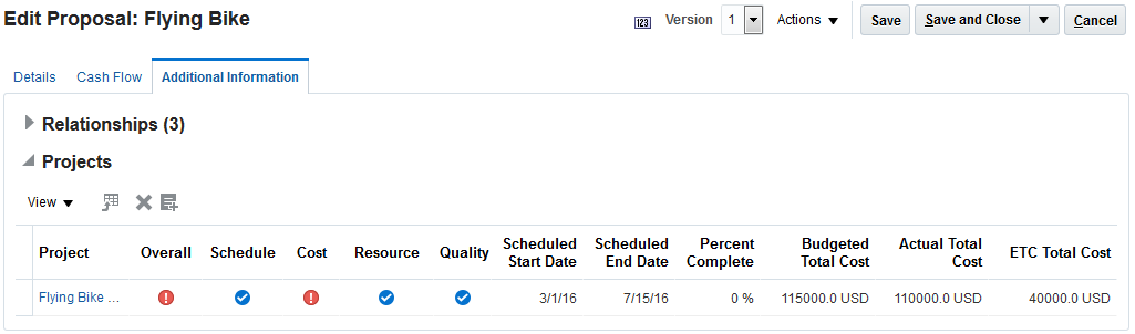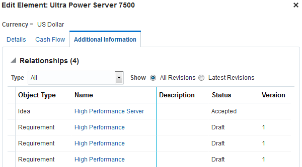 With this release, a Relationships table has been added to the Elements dialog for the proposal details. In addition to seeing the proposal details, portfolio reviewers can now quickly navigate to related information, such as the ideas driving the request and the status of requirements and concepts.