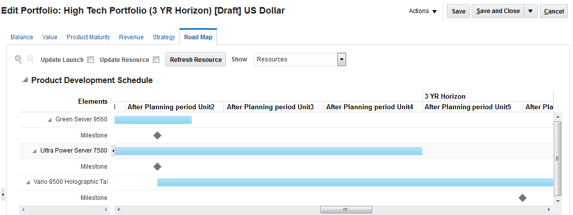 With this release, when Agile Product Portfolio Management projects are automatically linked, you will be able to view proposal start and end dates, proposal launch date (milestone), and the linked Agile PLM project start and end dates in a Gantt chart. This provides a more comprehensive view of planned versus actual schedules. The additional schedule details are easily viewable on the Resources tab of the portfolio as you expand each proposal.