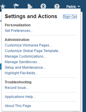 To customize pages, administrator must first create a sandbox and activate it. Next, from the Order Management work area landing page, click Customize Pages in the User Settings and Actions menu (menu beside user name). You can use Design Mode to add new content to the Order Management landing page. You can also use Select Mode to modify content on all other work area pages.