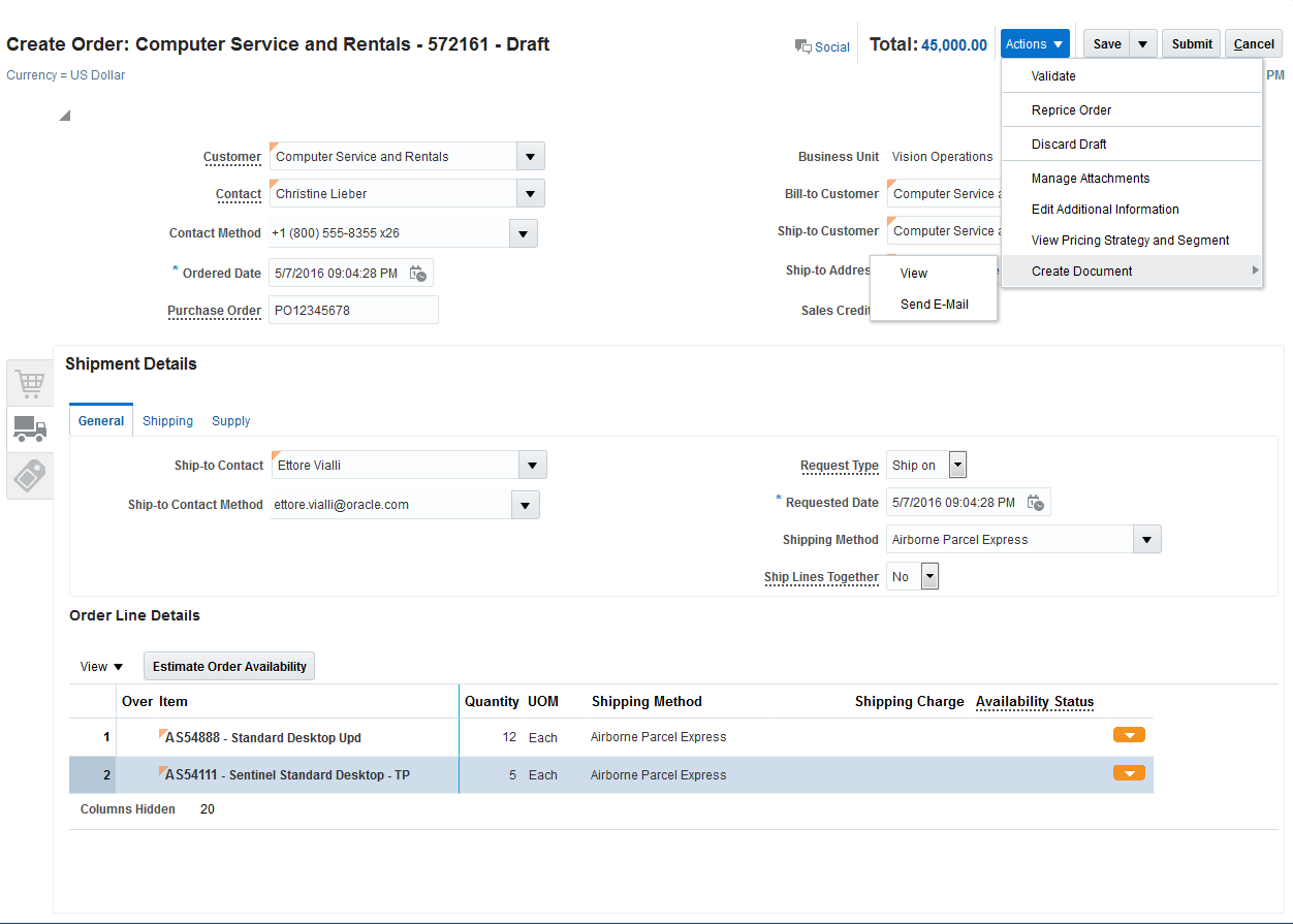 Oracle Order Management Cloud is the center of your multichannel order-to-cash system. It provides the central order hub and associated services, such as order capture, pricing, and configuration. You can receive orders from external sources, modify them in Order Management, and then process them for fulfillment. Alternatively, you can enter and process orders directly in Order Management. Order Management provides prebuilt integrations with other Oracle Cloud services, and supports centrally managed orchestration policies, global supply availability, status monitoring, and exception order management.