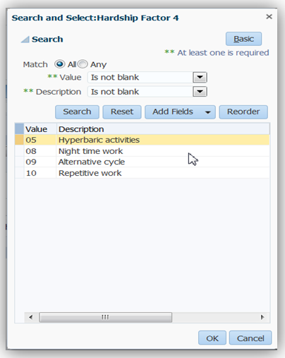 - Hardship Factor: Hyperbaric activities, Night time work, Alternative cycle, Repetitive work