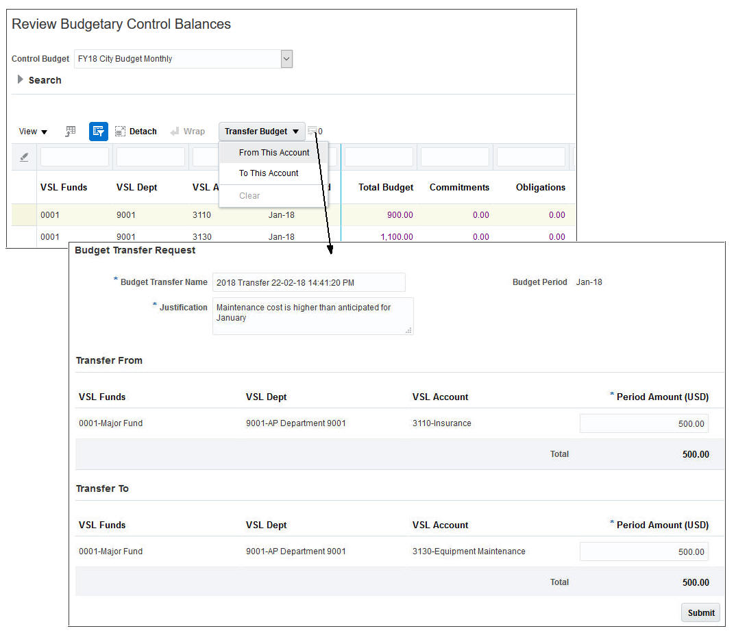 The budget transfer feature provides a quick and simple way to transfer budget to and from one or more budget accounts without having to fill out a budget spreadsheet. While reviewing budget balances in the Review Budgetary Control Balances page, build your Budget Transfer Request by selecting the budget accounts for transfer. Enter the transfer amount and justification for the budget transfer before initiating your budget transfer request. Receive a notification when the budget transfer is complete.