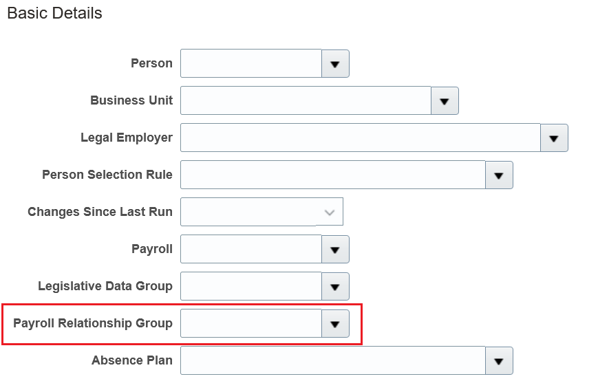 There is now a new parameter called Payroll Relationship Group for the Evaluate Absences process in the Schedule and Monitor Absence Processes page. You can select a specific payroll object group from the Payroll Relationship Group option when you submit the absence process. The application will then reprocess the absence entries of only those employees who belong to the payroll group you select.