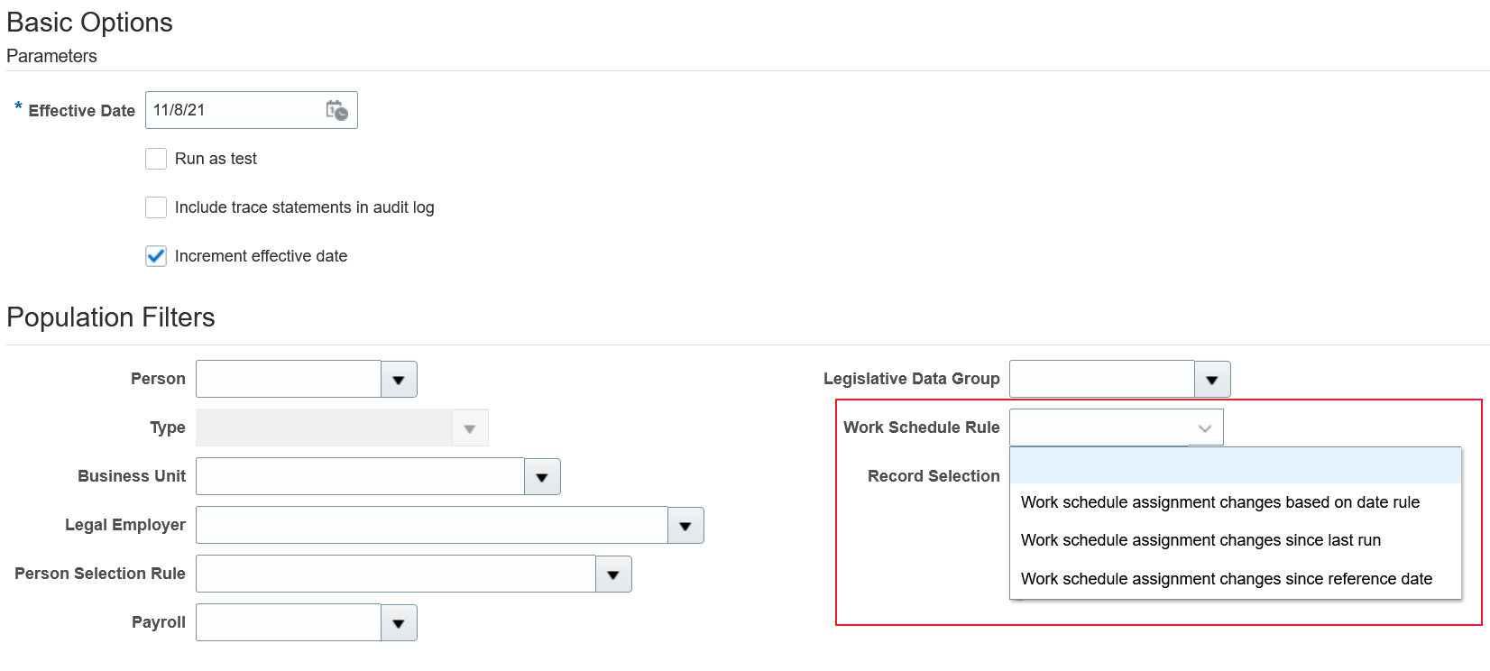 Additionally, you can now configure the Evaluate Absences process to look for changes in availability patterns using the existing Work Schedule Rule parameter. Use it to reprocess the absences of only those employees whose work schedule assignments have changed.