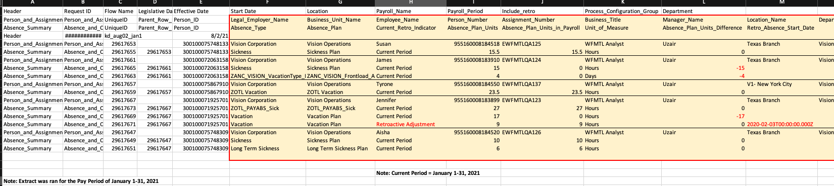 The extract includes absence entries that belong to the current payroll period. Here’s the data that is extracted:
