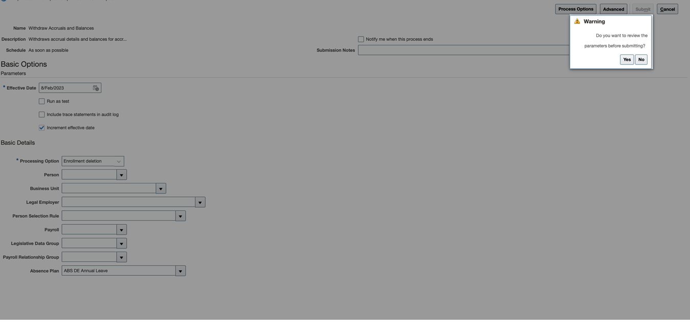 When you enter the parameters for the Withdraw Accruals and Balances absence process and click Submit, the application displays a warning message. The warning message allows you to review the parameters you set for the absence process before submitting. Reviewing the accrual withdrawal and enrollment deletion process prior to submission ensures the process is run with the correct parameters and important data is not lost.