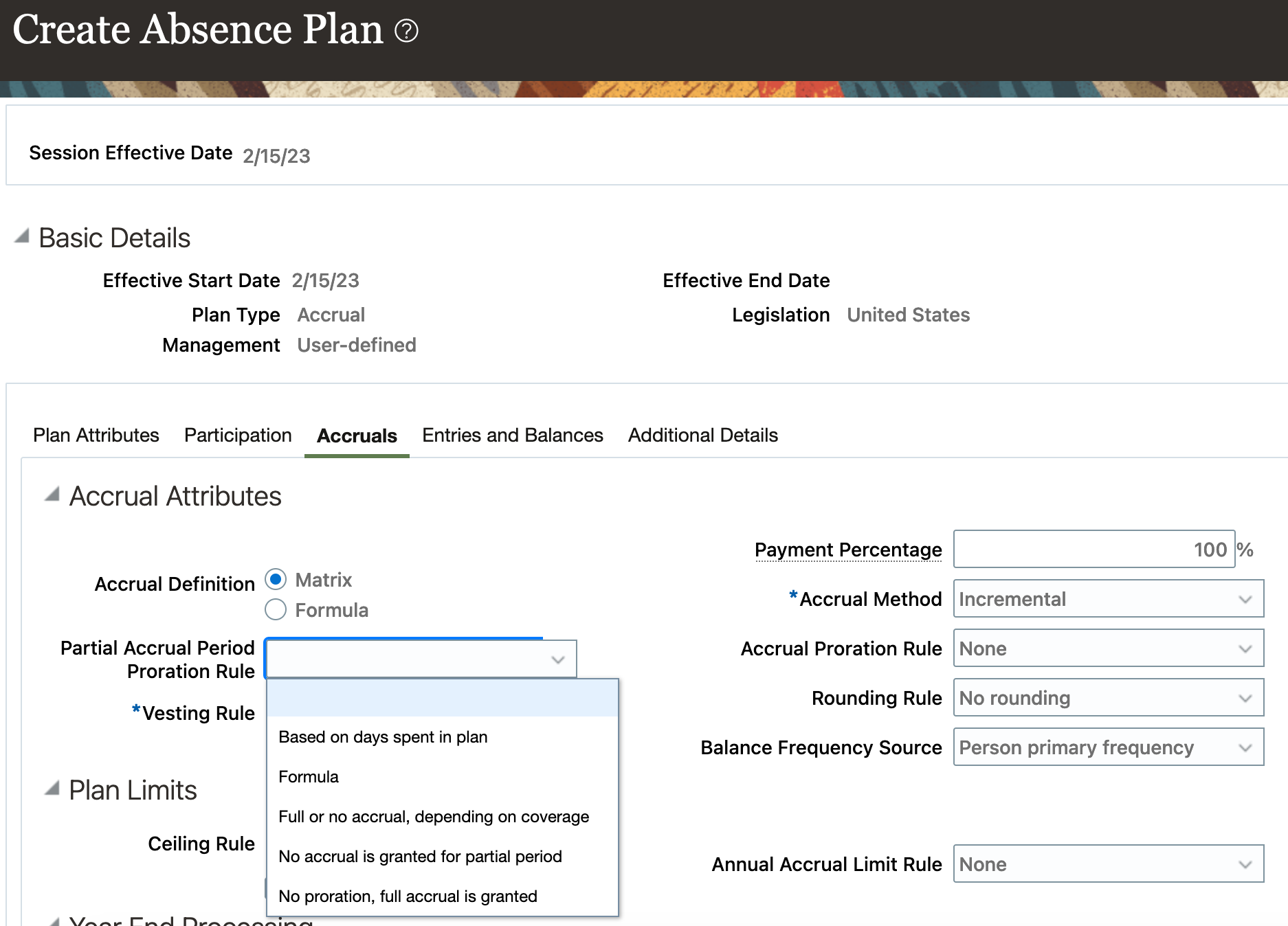 Setting up partial period accrual plan participation is now easier with predefined proration calculations. Similarly, you can also use predefined rounding rules for accrual calculations.