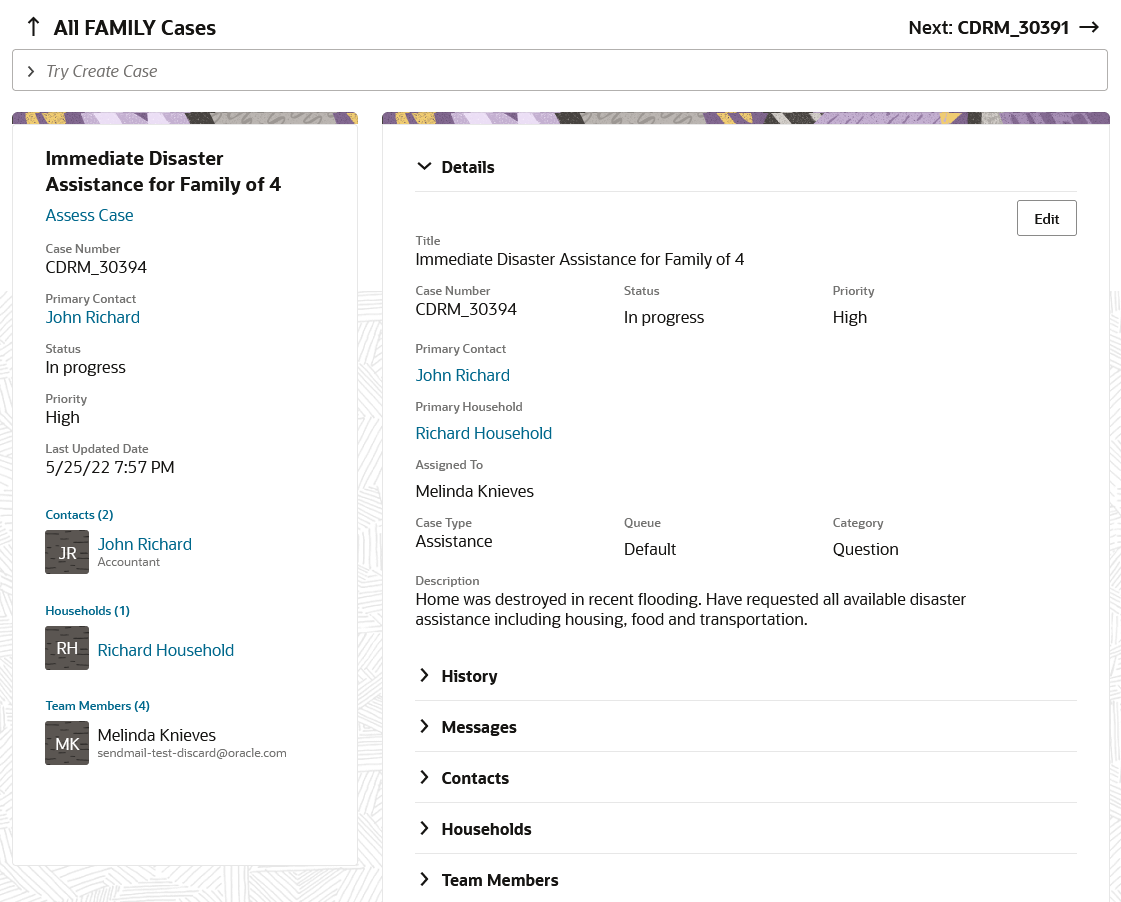 Case managers can add and share internal messages with all case workers. In addition, cases can be related to other cases and service requests to perform business-driven updates for those related objects. Case intake can also be easily easily completed using the new case creation interface. This feature also enhances case contact management and improves accessibility support.