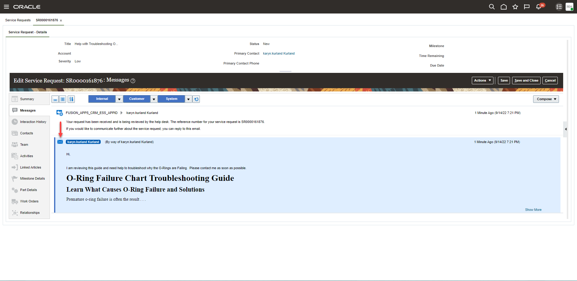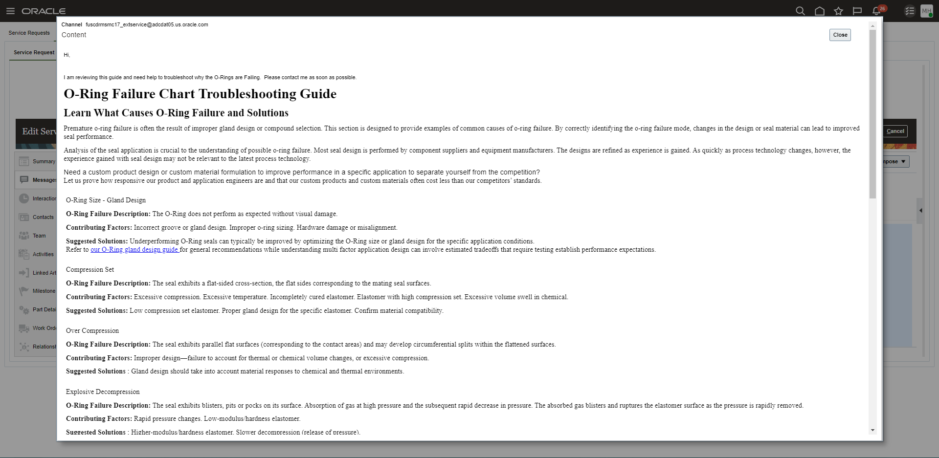 The Messages tab of the Edit Service Request page lets you view the complete email content without any truncation. Click the Email icon on the Messages tab of the Edit Service Request page. The complete email content, along with the email channel information, is displayed in a new window. Click the Close button to close this window.