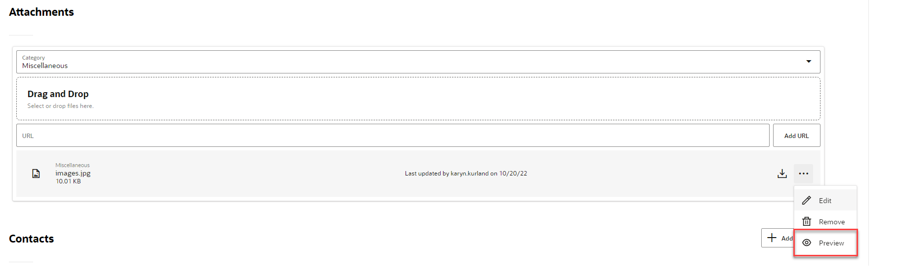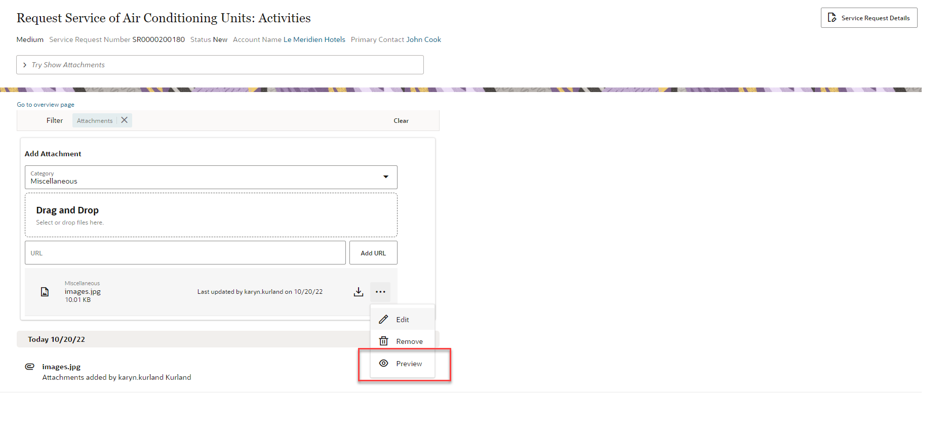 In the Redwood user experience, you can preview image file attachments from the Service Request Overview and Service Request Details pages. If you're on the Service Request Overview page, select the Show Attachments action in the Action Bar, and then in the Attachments section, click More Actions > Preview. If you're on the Service Request Details page, click More Actions > Preview in the Attachments section. Not all attachment types are supported at this time for preview.