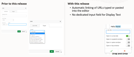- There is automatic linking of URLs that are typed or pasted into the editor. The default target for these links is to open it in a new browser tab.