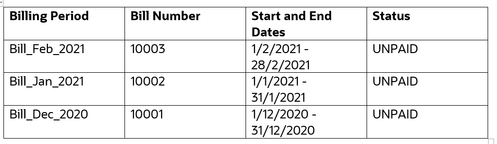 In the following example, there are more billing charges that are in unpaid status. If you want to delete the bill number 10001 or 10002, you need to first delete the bill number 10003.