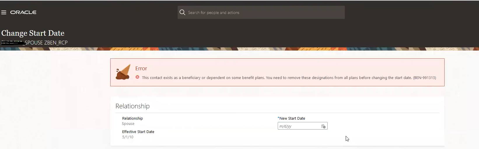 A new check from the Benefits side prevents HR specialists from changing the start date of a contact when the contact has active designations before the new start date. If there are any such designations and if the contact is an eligible dependent, the error message appears. If the administrators need to change the start date of the contact, they can back out the currently active events and then change the start date.