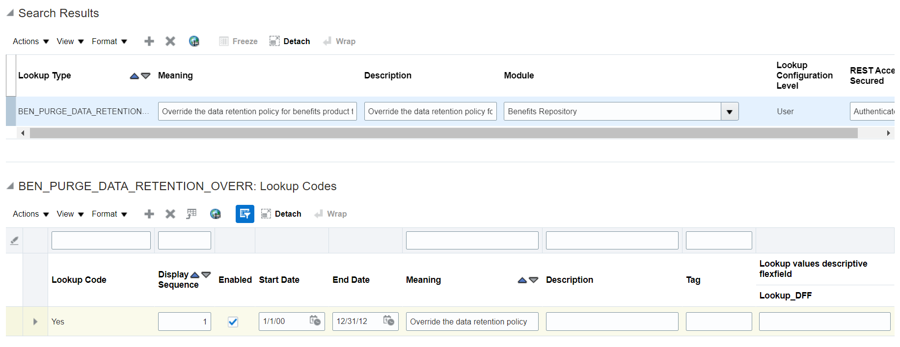 You’ll need to purge the transaction audit data from time to time. You can only purge the data that is older than 6 months to prevent the required data from being accidentally purged. However, you can override this 6 months retention policy, if required, by creating a lookup type [BEN_PURGE_DATA_RETENTION_OVERR ] with the lookup value Y/Yes. To create the lookup type, search for the Manage Common Lookups task in the Setup and Maintenance work area, and click Actions, New under Search Results.