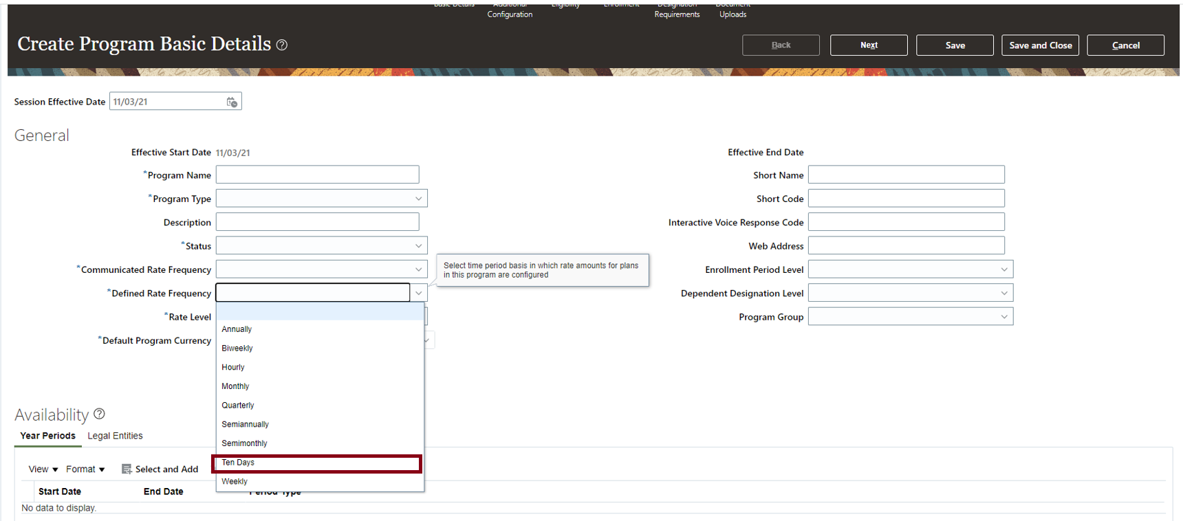 The payroll frequency of a worker is passed to payroll for processing. A new lookup code, Ten Days, is provided to allow you to select the new rate frequency when defining or updating a program.