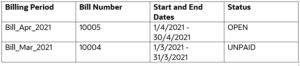 In the following example, there is one billing charge that is in open status and one in unpaid status. If you want to delete the bill number 10004, you need to first delete the bill number 10005.