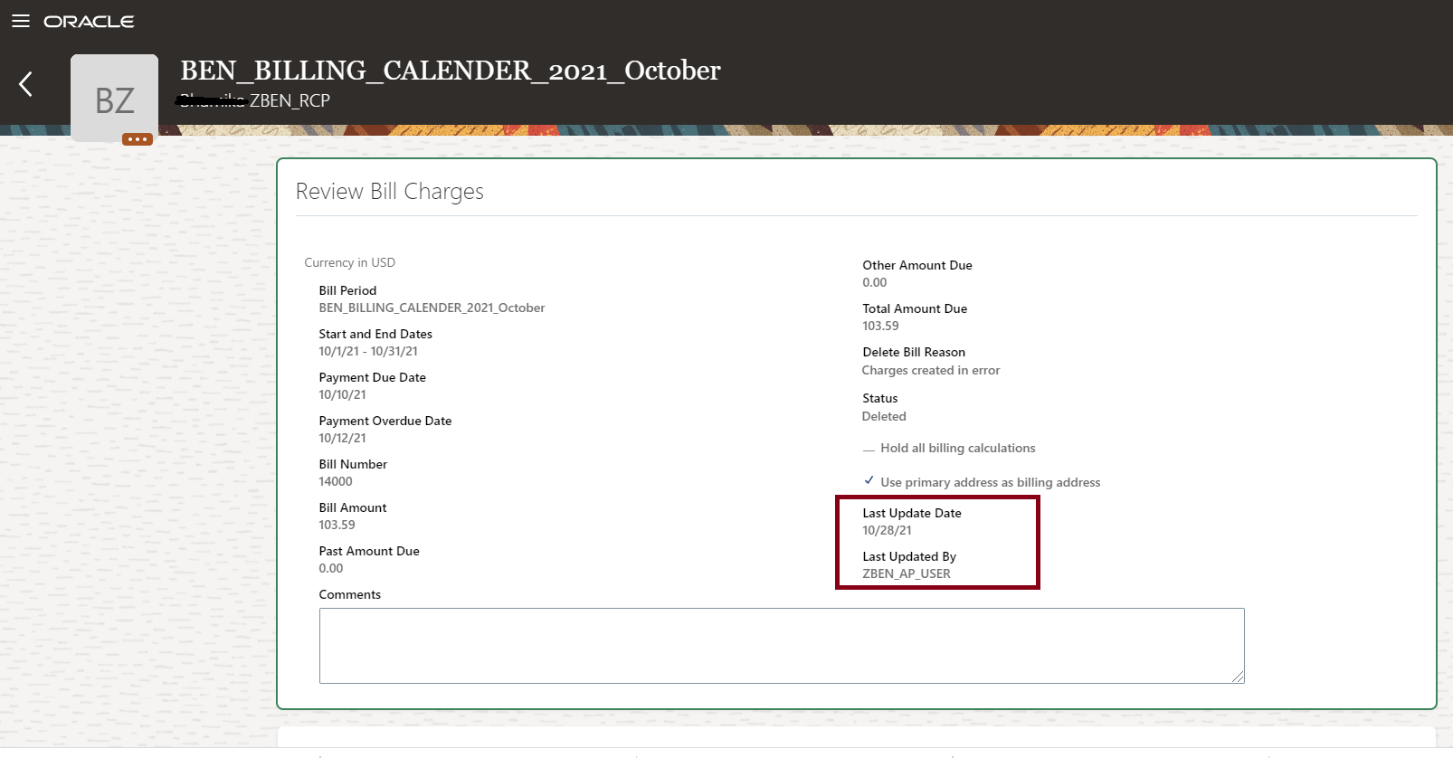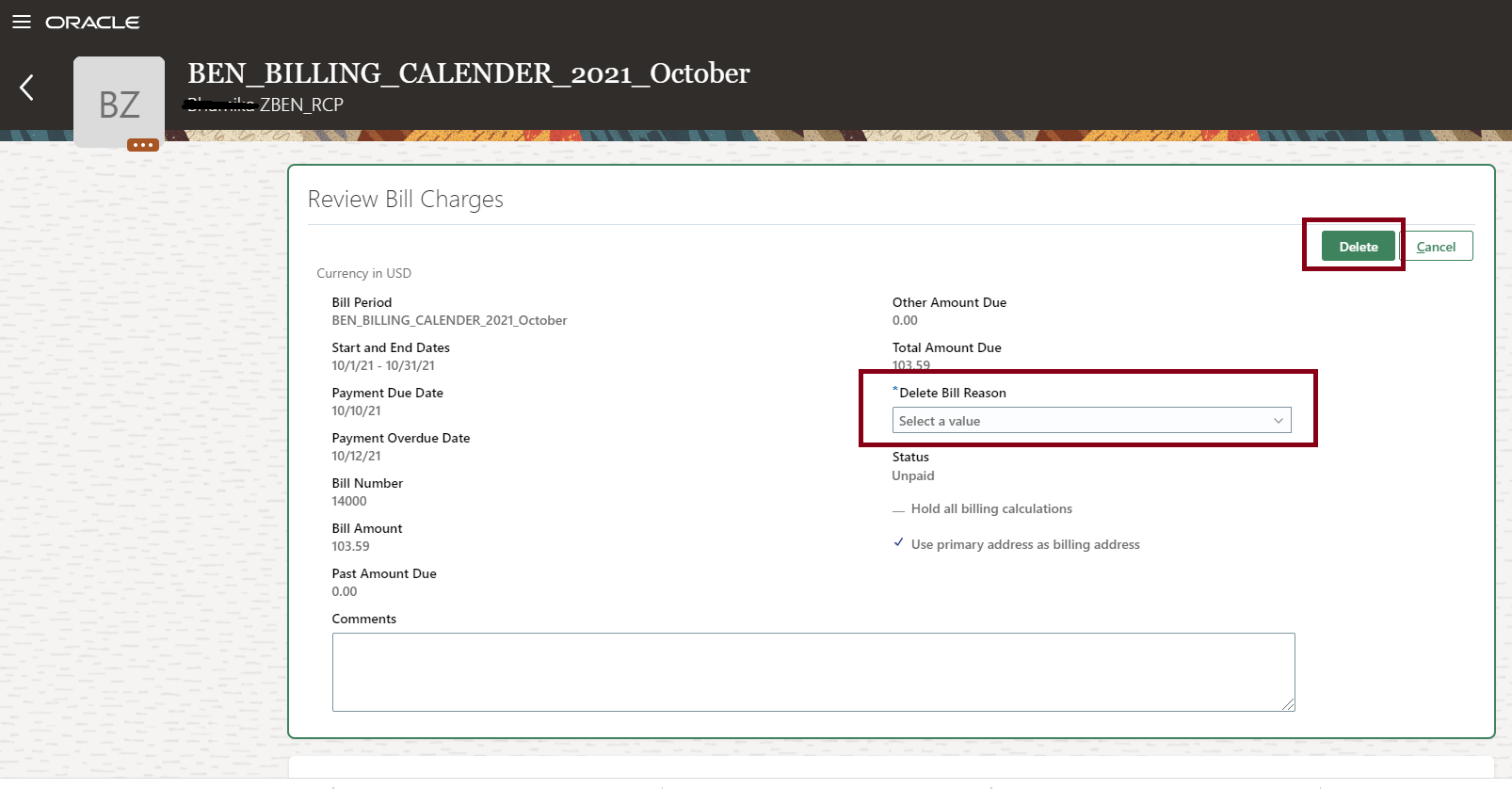 You can add reasons and comments on why you are deleting the billing charges. Such details are useful for future reference. You need to extend a lookup named Reason for Deleting the Bill Charge (ORA_BEN_BILL_DEL_REASON) to add your business-specific reasons.